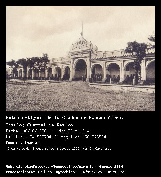 Cuartel de Retiro - 00/00/1850 - [1014] - Orden: 6 El paraje que hoy se denomina Plaza San Martín, antes Retiro, fue destinado en 1702 a Mercado de esclavos, y más tarde a Plaza de Toros, la que subsistió hasta la época del directorio de Rondeau. En 1822, al hacerse extensiva la prohibición de las corridas a toda la provincia de Buenos Aires, se demolió la plaza que era de ladrillo y sus materiales empleados en la construcción del Cuartel del Retiro. Al tosco pavimento de la nota fotográfica ha sucedido el liso de que hoy se dispone, y al viejo cuartel los locales del Museo y Comisión Nacional de Bellas Artes.