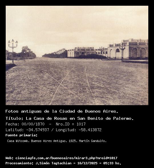 La Casa de Rosas en San Benito de Palermo. - 00/00/1870 - [1017] - Orden: 17 Muy cerca del Monumento a los Españoles, estuvo situada la cada de recreo que Juan Manuel de Rosas poseyó en Palemo, la que circundaba un extenso terreno cubierto de jardines y arboledas. Durante el gobierno de Sarmiento el paraje se denominó Parque 3 de febrero, y en la residencia estuvieron instalados -sucesivamente-, el Colegio Militar y la Escuela Naval. La estatua de Sarmiento hoy está en el mismo lugar donde había estado la casa de Rosas.