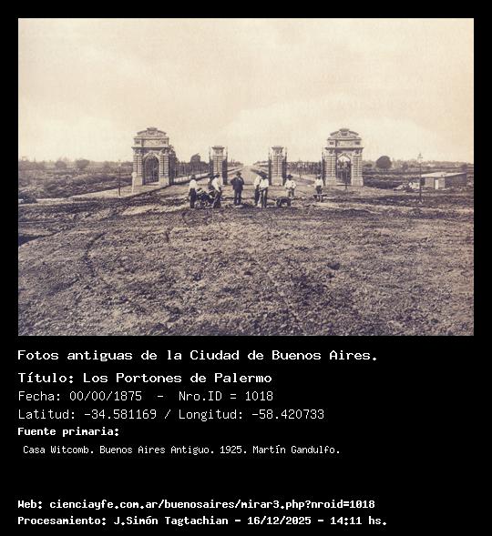 Los Portones de Palermo - 00/00/1875 - [1018] - Orden: 22 Los portones (1875), a modo de propíleos se hallaban situados en la cabecera de la Avenida Sarmiento y fueron demolidos en 1917. El vasto terreno que se extendía entre los Portones y la calle Santa Fe se transformó en la actual Plaza Italia, cuyo centro ocupa la estatua ecuestre de Garibaldi. El solar de la izquierda hoy corresponde a la Exposición Rural y el de la derecha al Jardín Zoológico.