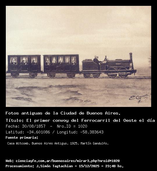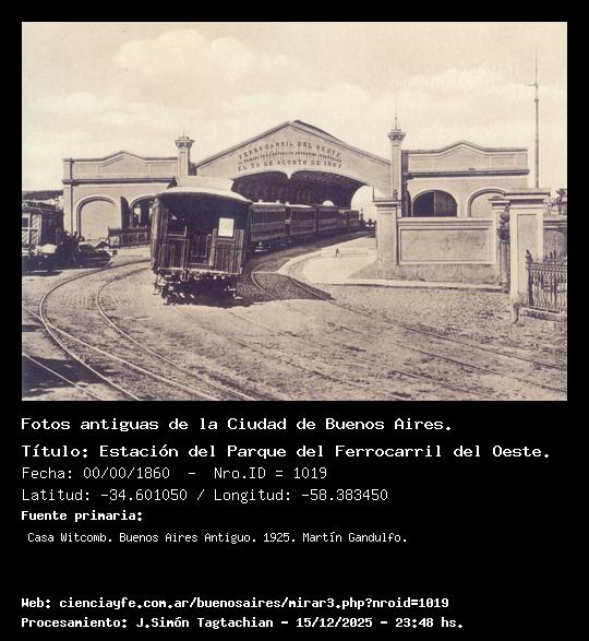 Estación del Parque del Ferrocarril del Oeste. - 00/00/1860 - [1019] - Orden: 13 En el emplazamiento actual del Teatro Colón fue inaugurado el primero de los ferrocarriles de la República el 30 de agosto de 1857. Lo construyó una empresa formada por capitalistas argentinos denominada Sociedad del Camino de Hierro de Buenos Aires al Oeste.