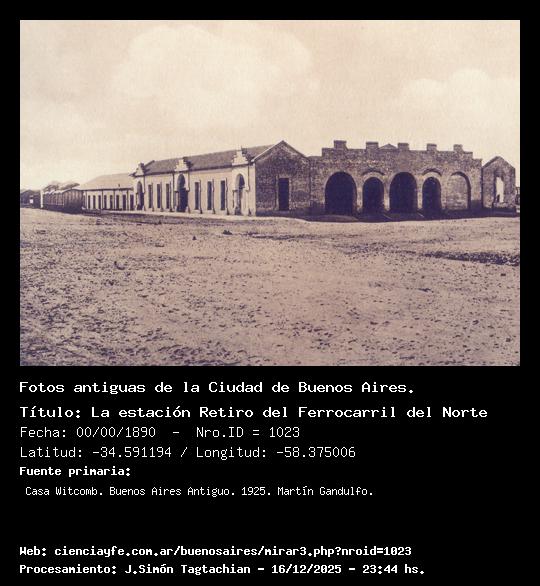 La estación Retiro del Ferrocarril del Norte - 00/00/1890 - [1023] - Orden: 37 El 7 de diciembre de 1862 se inauguró el promer recorrido de este ferrocarril en una extensión de 6 km, o sea, entre las estaciones Retiro y Belgrano; el 63 fue prolongado hasta Olivos y el 64 llegó hasta Tigre, límite de la concesión.