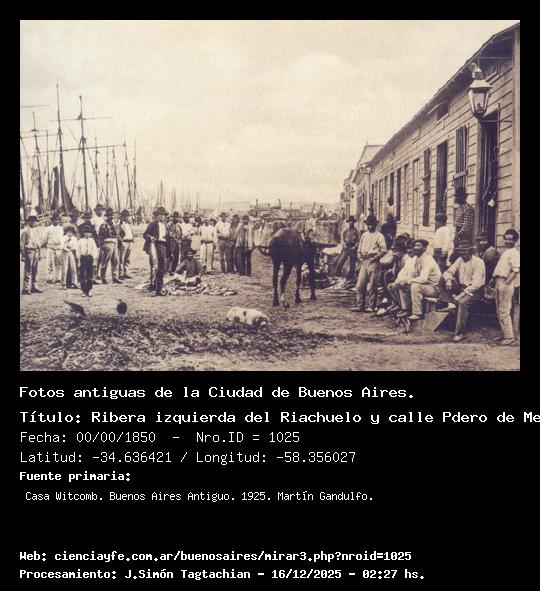 Ribera izquierda del Riachuelo y calle Pdero de Mendoza - 00/00/1850 - [1025] - Orden: 8 El origen del puerto de cabotaje de Buenos Aire, con sus casas de madera, algo elevadas sobre el nivel del suelo para defenderlas de los desbordes del Riachuelo, sin pavimiento alguno entre el talud y las construcciones y su abigarrada población marinera, nos lo muestra esta vista en forma acabada.