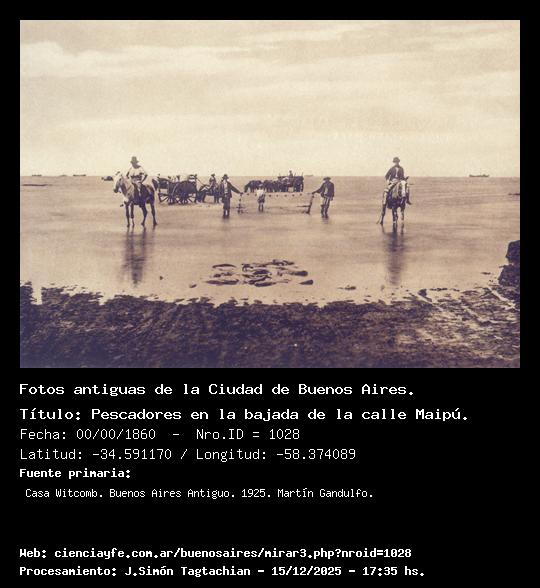 Pescadores en la bajada de la calle Maipú. - 00/00/1860 - [1028] - Orden: 14 La pesca con red tirada por caballos fue un espectáculo frecuente en la ribera norte, desde el Retiro hacia la Recoleta y Palermo; y, desde tiempos remotos, la forma de proveer de pescado a la población, que hacía de él un gran consumo. La escena de esta fotografía está tomada en el comienzo de la barranca de Maipú, es decir entre la Fábrica del Gas y la Estación del Retiro del Ferrocarril del Norte.