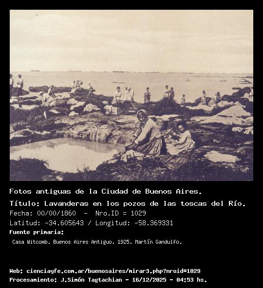 Lavanderas en los pozos de las toscas del Río. - 00/00/1860 - [1029] - Orden: 15 Tanto la ribera norte como en la del sur, mientras el río no estuviese crecido, era dable observar escenas como la que ofrece esta nota. El taller de lavado se establecía mediante la excavación en la tosca de una especie de pileta o pozo, cuyo contenido líquido se encargaba de renovar el flujo y reflujo de las aguas. En estos pozos se lavó la ropa de toda la Ciudad desde tiempo inmemorial por mujeres que soportaban con sin igual estoicismo los rigores del clima, hasta que el agua corriente vino a libertarlas de tan rudo trabajo.