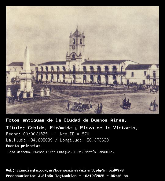 Cabido, Pirámide y Plaza de la Victoria. - 00/00/1829 - [970] - Orden: 1 Al ingenierio Carlos Ernesto Pellegrini se debe esta vista que data de 1829, en que se ve representado el edificio que tuvo su sede de gobierno de la ciudad, desde cuya torre la campana del reloj anunció, el día 25 de mayo de 1810, el advenimiento de la era de la emancipación política de las que, seis años más tarde se denominaron "Provincias Unidas del Sur". Completan la vista de la plaza, desnuda de árboles y huérfana de todo pavimento, la primitiva Pirámide erigida en 1811, la casa que fue del Obispo, y hacia la esquina de Bolivar y Victoria, la de Aguirre, y acera por medio, la que más tarde se conoció por Altos del Crisol.
