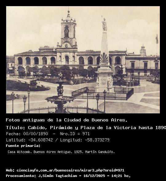 Cabido, Pirámide y Plaza de la Victoria hasta 1890. - 00/00/1890 - [971] - Orden: 34 Sin ser substanciales, el Cabildo de los días de la Revolución experimentó pequeñas reformas, y en tal estado permaneció hasta que su torre fue elevada en otro tanto de lo que muestra esta imagen, la que, pocos años después, fue demolida en su totalidad al efectuarse la apertura de la Avenida de Mayo.