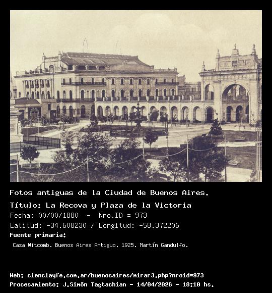La Recova y Plaza de la Victoria - 00/00/1880 - [973] - Orden: 25 El solar en que se edificó el Teatro Colón, hoy transformado en Banco de la Nación Argentina, es el mismo que hasta fines del Siglo XVIII de denominó "Hueco de las Ánimas".