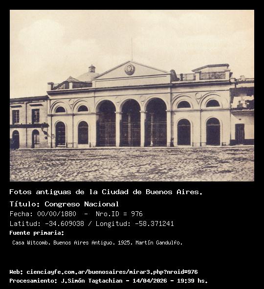 Congreso Nacional - 00/00/1880 - [976] - Orden: 26 El sitio fue sucesivamente, carnicería, cuartel y mercado. Terminó siendo el Congreso Nacional desde 1862 a 1897, y luego fue el Archivo General de la Nación. Bajo la bóveda de cristales que cubre el recinto -se hizo eso para cuidarlo-, resonó la elocuencia parlamentaria de Mitre, Rawson, Sarmiento, Frías, Mármol, Vélez Sarsfield, Gorostiaga, Quintana, Avellaneda, Bernardo de Irigoyen, etc.