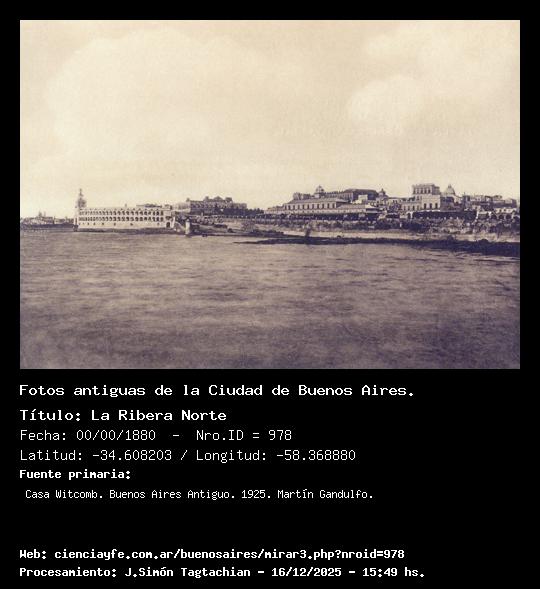 La Ribera Norte - 00/00/1880 - [978] - Orden: 28 La demolición del hemiciclo de la Aduana Nueva y su muelle, las transformaciones y ensanches de la primitiva Casa Rosada, la destrucción por un incendio, de la Estación Central de Trenes (14 de febrero de 1897) y la reedificación que han experimentado gran número de casas sobre el Paseo de Julio (hoy Paseo Colón) y la calle 25 de mayo, han cambiado en tal forma las líneas generales de esta parte de la Ciudad que fácilmente se echa de ver lo poco que de ella aún subsiste. Sobre los terrenos ganados al río hoy (1925) se hallan los diquesdel puerto, los depósitos de la Aduana, las nuevas calles y jardines del Paseo de Julio, la plaza Colón, el monumento a Brown, etc.