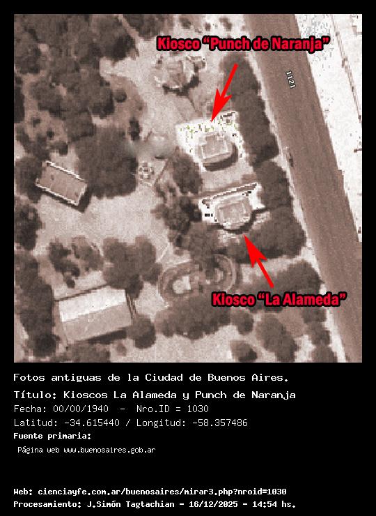 Kioscos La Alameda y Punch de Naranja - 00/00/1940 - [1030] - Orden: 2 La Alameda y Punch de Naranja son dos kioscos gemelos construidos circa 1932 por el Arq. Andrés Kálnay. El kiosco Punch de Naranja fue demolido, solo sobrevive La Alameda, donde degustamos bondiolitas y choripanes entre otras ricas comidas.