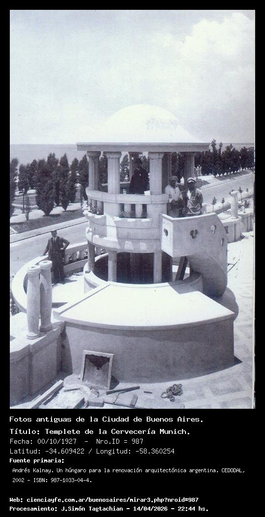 Templete de la Cervecería Munich. - 00/10/1927 - [987] - Orden: 3 Sobre el lado izquierdo se lo ve al Arq. Andrés Kálnay. En el templete se ve a operarios de la obra.