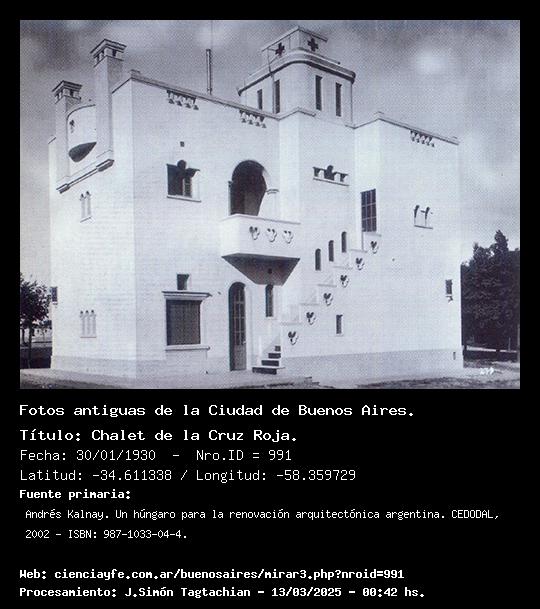 Chalet de la Cruz Roja. - 30/01/1930 - [991] - Orden: 9 Este Chalet se lo encargó la Cruz Roja Argentina a Kalnay. Alli funcionó durante un tiempo un centro de atención. En la actualidad, es un templo Judío. La foto muestra la cara que hoy no se ve por el trazado de las calles.