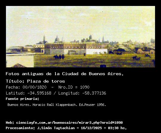 Plaza de toros - 00/00/1820 - [Id: 1090] Fuente:Buenos Aires. Horacio Raúl Klappenbach. Ed.Peuser 1956. |