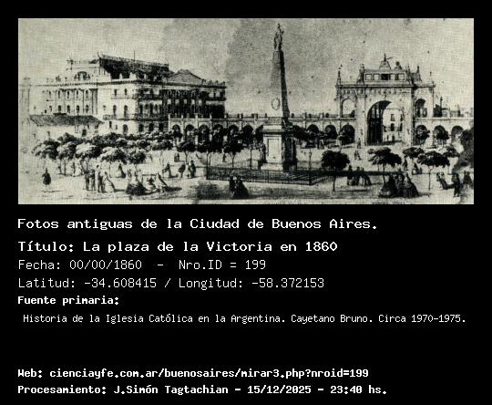 La plaza de la Victoria en 1860 - 00/00/1860 - [Id: 199] Fuente:Historia de la Iglesia Católica en la Argentina. Cayetano Bruno. Circa 1970-1975. Palabras claves:Recova Teatro Colón antiguo |