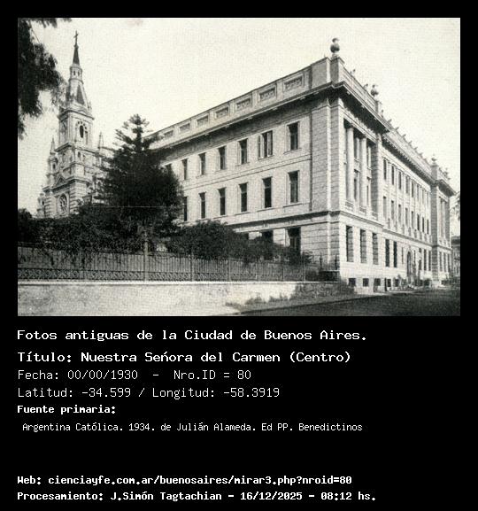 Nuestra Señora del Carmen (Centro) - 00/00/1930 - [Id: 80] Fuente:Argentina Católica. 1934. de Julián Alameda. Ed PP. Benedictinos Palabras claves:Iglesia Nuestra Señora del Carmen (Centro) |