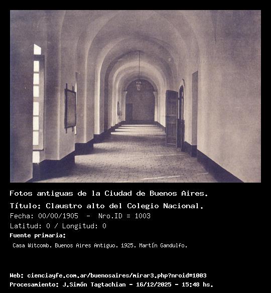 Claustro alto del Colegio Nacional. - Fecha: 00/00/1905 - [Id: 1003] La arquitectura jesuítica tuvo en este claustro, como en las demás partes del viejo Colegio San Carlos, un ejemplar acabado del tipo sencillo, pero sólido, qie caracterizó a las construcciones que llevó a cabo la Compañía en el Río de la Plata. Este claustro, que estaba orientado al norte, formaba, con su correspondiente del piso bajo, el mayor del Patio de Arena, y, en su extremo, hacia la calle Bolívar, se unía en ángulo recto el correspondiente a las salas del Gabinete de Física en el piso alto y las de la Rectoría en el bajo. Fuente:Casa Witcomb. Buenos Aires Antiguo. 1925. Martín Gandulfo.
