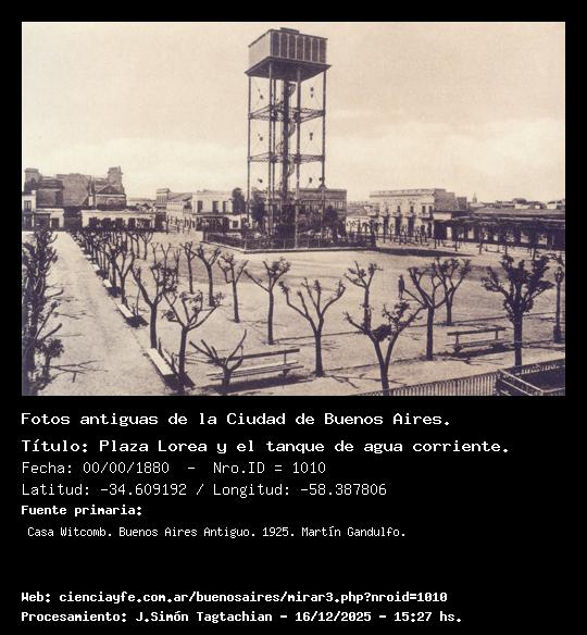 Plaza Lorea y el tanque de agua corriente. - Fecha: 00/00/1880 - [Id: 1010] Lo que hoy constituye la parte este de la Plaza del Congreso, se denominó Hueco de Lorea y más trde, plaza de Lorea. En su primera época, fue paradero de tropas y carretas y sitio al que acudían los indios a comerciar sus productos. Convertido en plaza, quedaron subsistentes por mucho tiempo los cuartos que, con su correspondiente corredor, alojaban los comercios que frecuentaban los tropero, que se notan sobre la derecha de la lámina. En el centro de la plaza se construyó el primer tanque de agua corriente que tuvo Buenos Aires, de una altura de 43 metros y de una capacidad de 480 metros cúbico, el que comenzó a funcionar el de abril de 1869 y dejó de hacerlo en 1887. Fuente:Casa Witcomb. Buenos Aires Antiguo. 1925. Martín Gandulfo.
