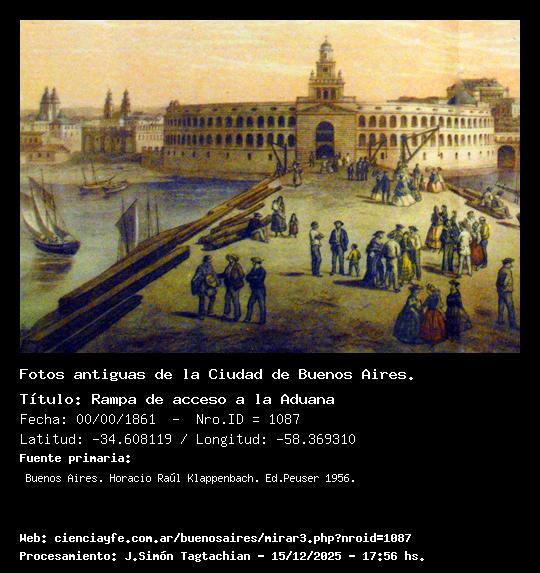 Rampa de acceso a la Aduana - Fecha: 00/00/1861 - [Id: 1087] Se ve la Aduana en primer plano, y sobre la izquierda primero las torres de San Ignacio, y más la izquierda, las torres de San Francisco y su cúpula. Fuente:Buenos Aires. Horacio Raúl Klappenbach. Ed.Peuser 1956.