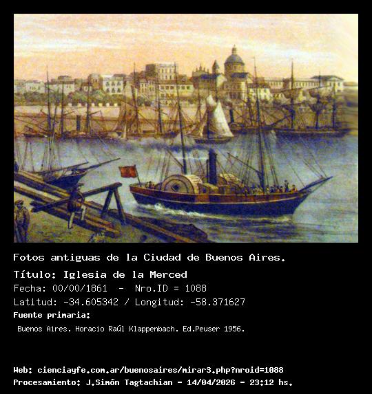 Iglesia de la Merced - Fecha: 00/00/1861 - [Id: 1088] Se ve en primer plano el río, justo al norte de la rampa de acceso de la Aduana. Luego el paseo de la alameda y la Iglesia de La Merced. Fuente:Buenos Aires. Horacio Raúl Klappenbach. Ed.Peuser 1956.