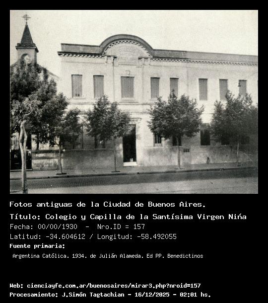Colegio y Capilla de la Santísima Virgen Niña - Fecha: 00/00/1930 - [Id: 157] Perteneciente a HH de la Caridad. Fuente:Argentina Católica. 1934. de Julián Alameda. Ed PP. Benedictinos