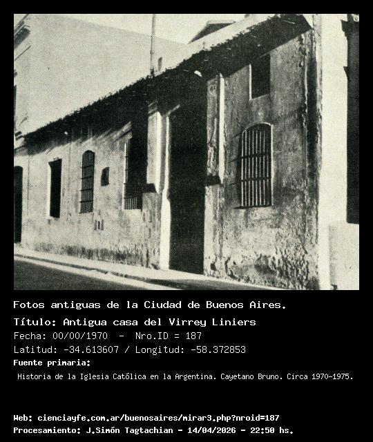 Antigua casa del Virrey Liniers - Fecha: 00/00/1970 - [Id: 187] Histórica casa colonial construida en 1788 (Calle Venezuela 469). En esta casa se firmó la capitulación del comandante de las tropas inglesas, William Carr Beresford, en presencia de Santiago de Liniers en 1806 (La Nación, 22/9/2009). Fuente:Historia de la Iglesia Católica en la Argentina. Cayetano Bruno. Circa 1970-1975.