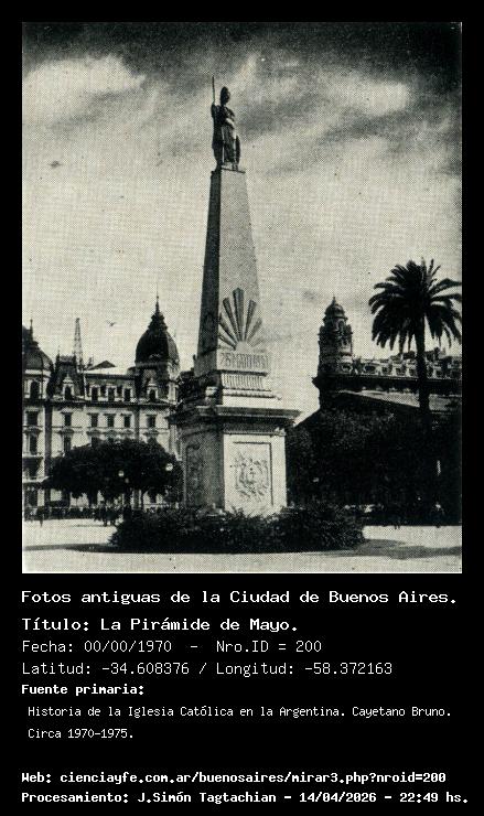 La Pirámide de Mayo. - Fecha: 00/00/1970 - [Id: 200] En la cúspide de la actual pirámide se encuentra la diosa Belona. Realizó la obra en 1856 el arquitecto pintor Prilidiano Pueyrredón, por encargo del Ayuntamiento. Solo en 1912 se trasladó la pirámide al sitio actual, en la prolongación de las calles Reconquista y Defensa. Fuente:Historia de la Iglesia Católica en la Argentina. Cayetano Bruno. Circa 1970-1975.