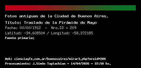 Traslado de la Pirámide de Mayo - Fecha: 00/00/1912 - [Id: 209] En 1912 se traslada la Pirámide de Mayo a la ubicación actual, al centro de la Plaza de Mayo. Fuente: