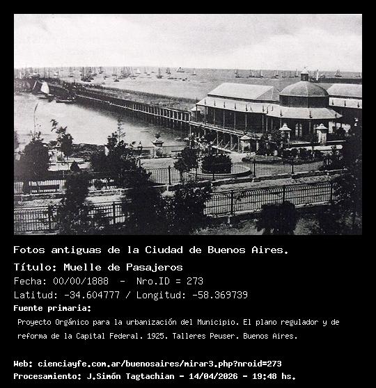 Muelle de Pasajeros - Fecha: 00/00/1888 - [Id: 273] El muelle de pasajeros quedó inaugurado en Septiembre de 1855 y se hizo sobre el bajo de La Merced. Tenia una extension de 210 metros de largo y se internaba perpendicularmente en el río (Leandro Alem hoy) entre las calles hoy llamadas Bartolome Mitre y Perón -Cangallo-. Tenía una gran plataforma sostenida por pilotes de madera dura, en la entrada había, a cada lado, un kiosco de control con un depósito de mercaderias anexo. Confrontar: http://www.histarmar.org/Puertos/BsAs/1854-1860.htm Fuente:Proyecto Orgánico para la urbanización del Municipio. El plano regulador y de reforma de la Capital Federal. 1925. Talleres Peuser. Buenos Aires.