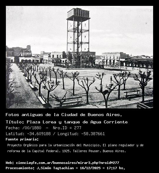 Plaza Lorea y tanque de Agua Corriente - Fecha: /00/1880 - [Id: 277] No pude determinar la orientación de la foto. Fuente:Proyecto Orgánico para la urbanización del Municipio. El plano regulador y de reforma de la Capital Federal. 1925. Talleres Peuser. Buenos Aires.