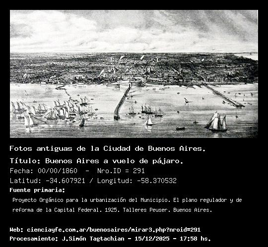 Buenos Aires a vuelo de pájaro. - Fecha: 00/00/1860 - [Id: 291] Aduana, Muelle. Fuente:Proyecto Orgánico para la urbanización del Municipio. El plano regulador y de reforma de la Capital Federal. 1925. Talleres Peuser. Buenos Aires.