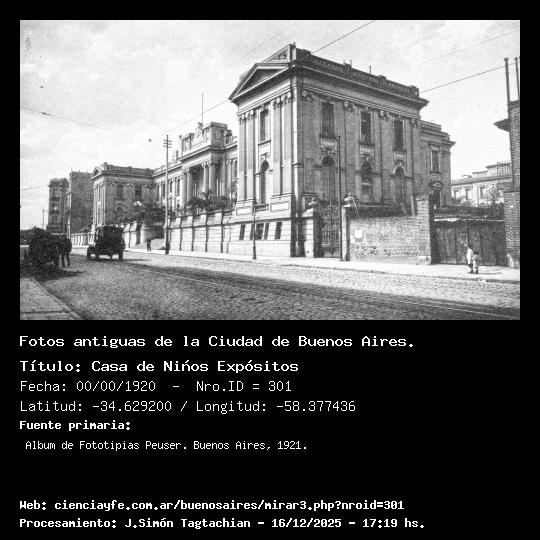 Casa de Niños Expósitos - Fecha: 00/00/1920 - [Id: 301] El 7 de agosto de 1779 se funda el Hospital y Casa de Niños Expósitos y el 9 de junio de 1780 ingresa la primera niña que había sido abandonada en la puerta. Es bautizada como Feliciana Manuela que fallece repentinamente a los pocos días. En 10 años la Casa recibió más de 2.000 niños. Su nombre original, el de Hospital y Casa de Niños Expósitos se debía que albergaba a los niños bandonados,"expuestos", en las calles o en los umbrales de las iglesias, los cuales eran comunmente atacados por los perros. Contaba con un torno de madera para recibirlos manteniendo el anonimato de las madres. Este armazón giratorio funcionó hasta 1891. Confrontar http://www.elizalde.gov.ar/hospital/hosp_pas.asp Fuente:Album de Fototipias Peuser. Buenos Aires, 1921.