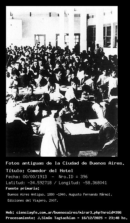 Comedor del Hotel - Fecha: 00/00/1913 - [Id: 396] Comedor del Hotel de los inmigrantes (Caras y Caretas, 1913, AGN). Fuente:Buenos Aires Antiguo. 1880 -1940. Augusto Fernando Mármol. Ediciones del Viajero, 2007.