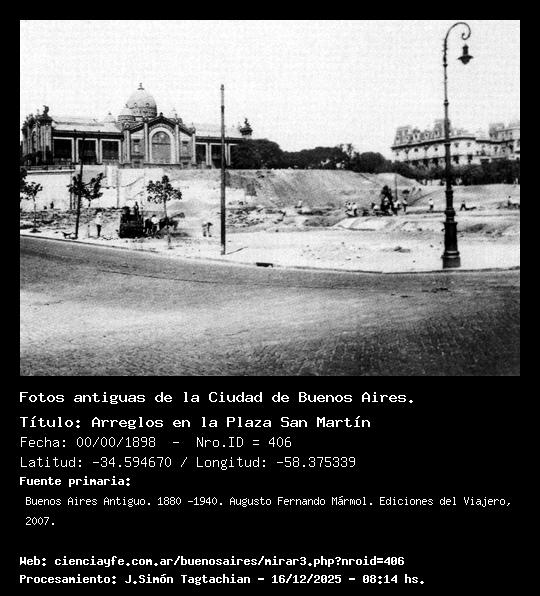Arreglos en la Plaza San Martín - Fecha: 00/00/1898 - [Id: 406] No hay que confundir estos arreglos con los que se harían luego, en 1930, momento en que removieron al Pabellón Argentino. Las demoliciones fueron entre 1933 y 1934 y permitieron ampliar la Plaza. Fuente:Buenos Aires Antiguo. 1880 -1940. Augusto Fernando Mármol. Ediciones del Viajero, 2007.