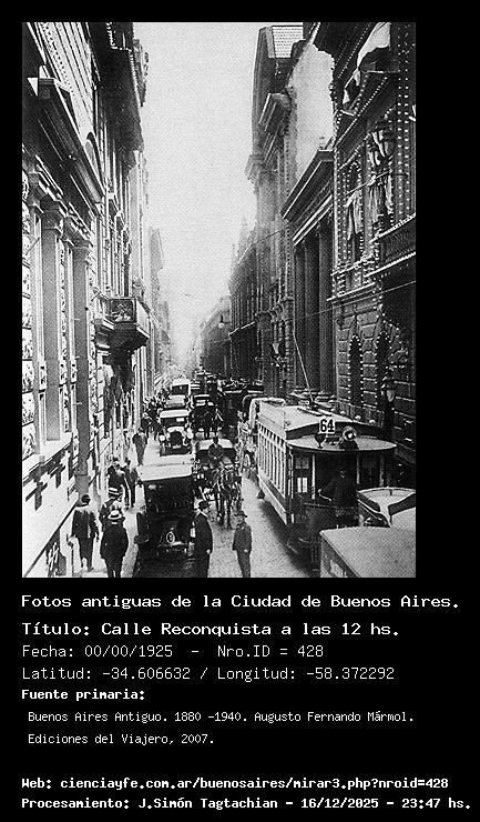 Calle Reconquista a las 12 hs. - Fecha: 00/00/1925 - [Id: 428] Fuente:Buenos Aires Antiguo. 1880 -1940. Augusto Fernando Mármol. Ediciones del Viajero, 2007.