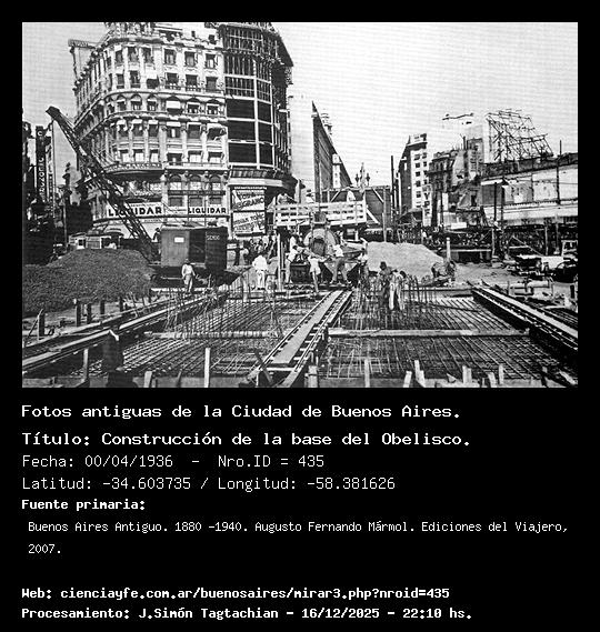 Construcción de la base del Obelisco. - Fecha: 00/04/1936 - [Id: 435] Fuente:Buenos Aires Antiguo. 1880 -1940. Augusto Fernando Mármol. Ediciones del Viajero, 2007.