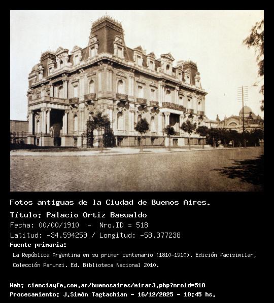 Palacio Ortiz Basualdo - Fecha: 00/00/1910 - [Id: 518] Palacio de la Sra. Inés Dorrego de Ortiz Basualdo. Arq. J.Dormal. Al fondo, se ve el Pabellón Argentino. Ambos edificios fueron demolidos. Fuente:La República Argentina en su primer centenario (1810-1910). Edición facisimilar, Colección Panunzi. Ed. Biblioteca Nacional 2010.