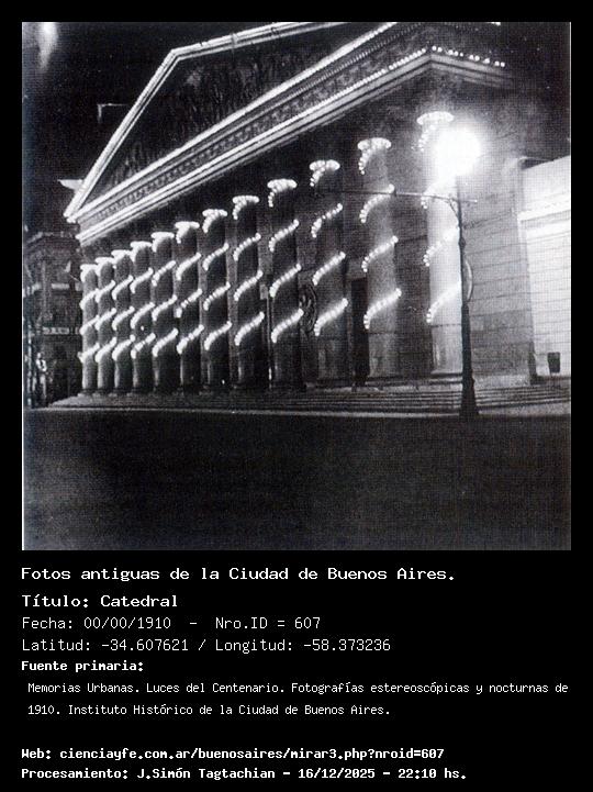 Catedral - Fecha: 00/00/1910 - [Id: 607] La Catedral muestra su fachada definitiva. El pórtico neoclásico inspirado en el Palais Bourbon, diseñada e iniciada por los arquitectos franceses Próspero Catelin Y Pedro Benoit. Continuada por Juan Pons y concluida en 1827 por Pedro Ponce y José Santos Sartorio. El edificio que se ve detrás, en la esquina de Rivadavia y San Martín (de planta baja y tres pisos) fue demolido en 1927. Fuente:Memorias Urbanas. Luces del Centenario. Fotografías estereoscópicas y nocturnas de 1910. Instituto Histórico de la Ciudad de Buenos Aires.