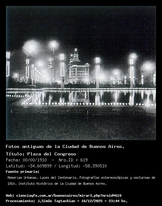 Plaza del Congreso - Fecha: 00/00/1910 - [Id: 619] El espejo de agua refleja las luces. Todavía no se había erigido el Monumento a los dos Congresos. Se ve el edificio de la Inmobiliaria y el Hotel Majestic. Fuente:Memorias Urbanas. Luces del Centenario. Fotografías estereoscópicas y nocturnas de 1910. Instituto Histórico de la Ciudad de Buenos Aires.
