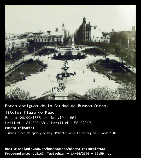 Plaza de Mayo - Fecha: 00/00/1898 - [Id: 661] Describiendo los edificio que se ven de derecha a izquierda: la Curia, la Catedral. En la esquina de Rivadavia y San Martín el edificio de tres pisos cuya planta baja, por Rivadavia, ocupaba la confitería Buenos Aires, propiedad de J. M. Lacalle y por San Martín la cigarrería de F. A. Olivero. Enfrente, ya por Bolivar, los altos de Urioste, y los altos de Riglos. Haciendo frente por Avda de Mayo, el edificio de la Municipalidad (en 1891 se había comenzado su construcción). Al fondo, arriba a la derecha, se ve la torre de San Nicolás de Bari. En el lado sur de la plaza, se ve el cabildo cortado, se ven los altos de Crisol. Se ve la recova nueva a un costado. La plaza está cerrada con las dos manzana al haberse cerrado la calle Defensa en 1890. Se ven las 8 palmeras muy chiquitas. Fuente:Buenos Aires de ayer y de hoy. Roberto Conde.Ed corregidor. Conde 1982.