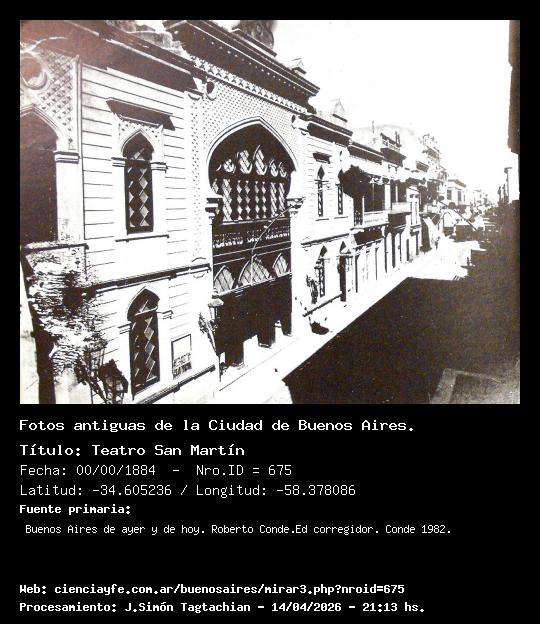 Teatro San Martín - Fecha: 00/00/1884 - [Id: 675] En este solar se hizo allí la primera pista de patinaje (Scating-Ring), luego otro teatro llamado Le Gaite, que luego denominaron San Martín el 4 de julio de 1887. Era de madera y se incendió dos veces. Lo reconstruyeron en mampostería reinaugurándolo el 25 de mayo de 1892. Esta foto es de 1884. En 1980 estaban las oficinas de YPF. Fuente:Buenos Aires de ayer y de hoy. Roberto Conde.Ed corregidor. Conde 1982.