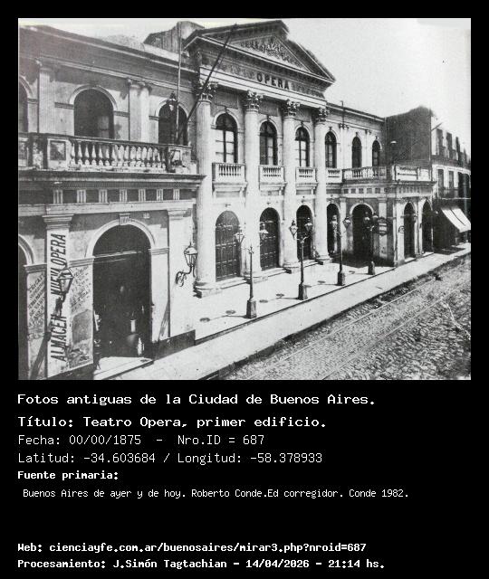 Teatro Opera, primer edificio. - Fecha: 00/00/1875 - [Id: 687] Primer edificio del Teatro Opera (1872). Hubo un segundo (frente 1880), y el actual es el tercero (1936). Fuente:Buenos Aires de ayer y de hoy. Roberto Conde.Ed corregidor. Conde 1982.