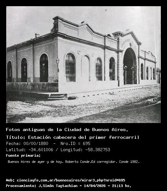 Estación cabecera del primer ferrocarril - Fecha: 00/00/1880 - [Id: 695] Estación cabecera del primer ferrocarril. Se comenzó a construir el 12 de enero de 1854. Se inauguró el 30 de agosto de 1857, y este ferrocarril llegaba hasta Floresta. Los planos de ambos frentes fueron realizados por A. Ringuelet (en 1867/69) que reemplazó una construcción más modesta. Fuente:Buenos Aires de ayer y de hoy. Roberto Conde.Ed corregidor. Conde 1982.