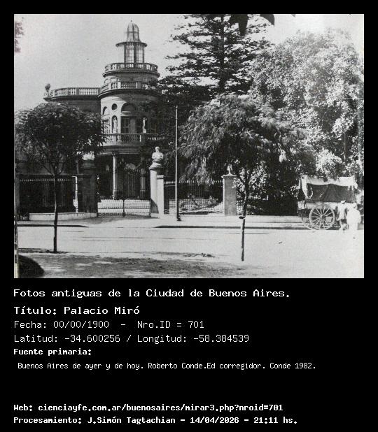 Palacio Miró - Fecha: 00/00/1900 - [Id: 701] El Palacio Miró estaba en Viamonte y Libertad. Se construyó en 1884 y se demolió en 1937 (para agrandar la Plaza Lavalle ¿?). Sobrevive el Ficus de la esquina, hoy gigante. También otros árboles de su parque interno. Fuente:Buenos Aires de ayer y de hoy. Roberto Conde.Ed corregidor. Conde 1982.