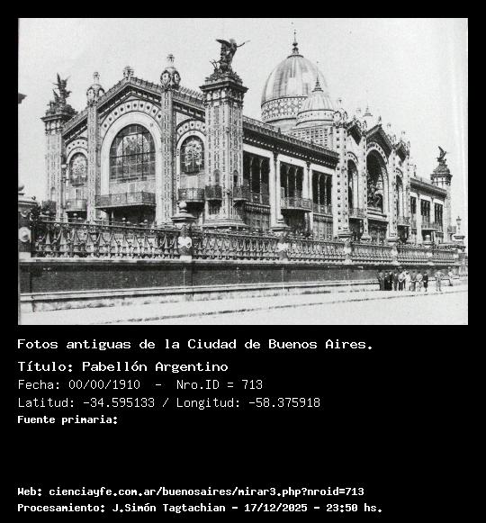Pabellón Argentino - Fecha: 00/00/1910 - [Id: 713] El Pabellón Argentino estuvo en Paris en la Exposición Universal de 1889. Dos años después, fue instalado en la Plaza San Martín. Fue demolido circa 1933 cuando esta se reacondicionó. Era obra del Arq. Roger Ballu. en 1910 Fuente: