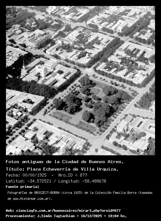 Plaza Echeverría de Villa Urquiza. - Fecha: 00/00/1925 - [Id: 877] Se observa también la Iglesia. Fuente:Fotografías de BROSZEIT-BORRA (circa 1925) de la Colección Familia Borra (tomadas de www.Histarmar.com.ar).