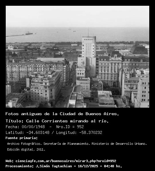 Calle Corrientes mirando al río. - Fecha: 00/00/1948 - [Id: 952] Fuente:Archivo Fotográfico. Secretaría de Planeamiento. Ministerio de Desarrollo Urbano. Edición digital, 2011.