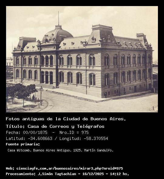 Casa de Correos y Telégrafos - Fecha: 00/00/1875 - [Id: 975] De la manzana en que se halló emplazado el viejo Fuerte solo fue edificada su mitad norte al construirse la Casa Rosada. Años después, durante la presidencia de Avellanedam de la mitad restante se ocupó el ángulo SO para levantar en él la primera casa de Correos y Telégrafos que tuvo la Ciudad, la que se inauguró el 29 de enero de 1873 y de la que disfrutó por muy poco tiempo; pues, la reedificación y ensanche de la de Gobierno la comprendió en su totalidad, y el Correo hubo de volver a ocupar la que abandonara al trasladarse a la propia. El primer servicio de correos de Buenos Aires data de 1747 ó 1748, el que estaba confiado a una empresa particular; en 1814 fue nacionalizado y en 1862 recibió el nombre de "Dirección General de Correos de la República". Fuente:Casa Witcomb. Buenos Aires Antiguo. 1925. Martín Gandulfo.