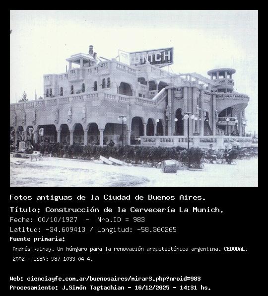 Construcción de la Cervecería La Munich. - Fecha: 00/10/1927 - [Id: 983] Puede verse el cartel del Arq. Andrés Kalnay justo en el lado izquierdo del cartel Munich. Fuente:Andrés Kalnay. Un húngaro para la renovación arquitectónica argentina. CEDODAL, 2002 - ISBN: 987-1033-04-4.