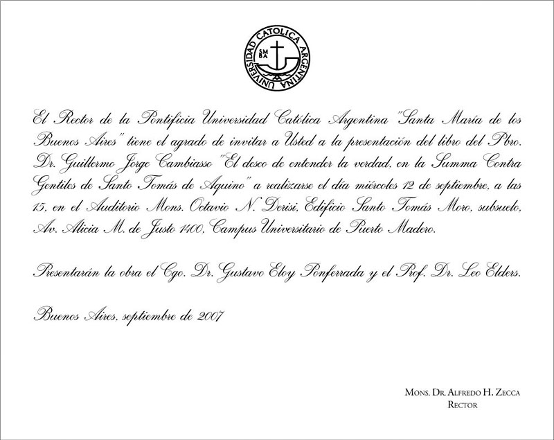 El miércoles 12 de septiembre de 2007, se presentará el libro del Pbro. Dr. Guillermo Cambiasso "El deseo de entender la verdad en la Summa Contra Gentiles de Santo Tomás de Aquino". La presentación se realizará en la Universidad Católica Argentina y están todos invitados a participar. Al pie podrán encontrar la invitación cursada por el Rector de la UCA, Mons. Dr. Alfredo H. Zecca. Y si desean comunicarse con el Padre Guillermo Cambiasso pueden escribirle a cambiassgj@arnet.com.ar