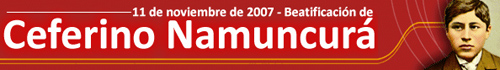 ![]() El 11 de noviembre de 2007 se realizó la betificación de Ceferino Namuncurá en Chimpay, Río Negro, Argentina. Si no pudieron ver la ceremonia, ponemos a su disposición dos videos: uno del momento en que Ceferino es proclamado beato y otro con la homilía del Cardenal Bertone. Si bien tienen 21 y 26 Mb, son realmente muy enriquecedores. Esperemos que los puedan disfrutar.